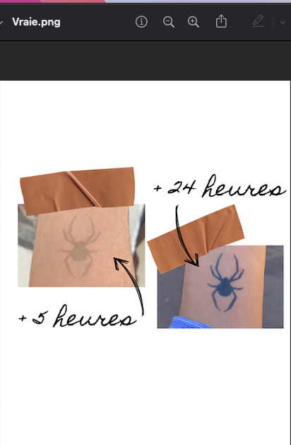 L'encre, appliquée sur la peau, fonce progressivement (de 12 à 24 heures) jusqu'à prendre la teinte d'un véritable tatouage. Il résiste à l'eau et au bout de 15 jours, il disparait progressivement.